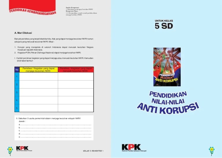 Sesuai petunjuk dalam modul pendidikan antikorupsi dari komisi pemberantasan korupsi (kpk) untuk sd kelas vi. Perpustakaan mengidentifikasi pengertian antikorupsi dan instrumen (hukum dan. Terutama pada sekolah dasar atau sd adalah salah satu instansi pendidikan yang bergerak dalam bidang formal yang bertujuan untuk mengembangkan kompetensi dasar . Rpp kelas 3 tema 2 revisi 2018 . Bagi guru sd/mi dalam rangka mengintegrasikan pendidikan antikorupsi dalam pembelajaran pkn.